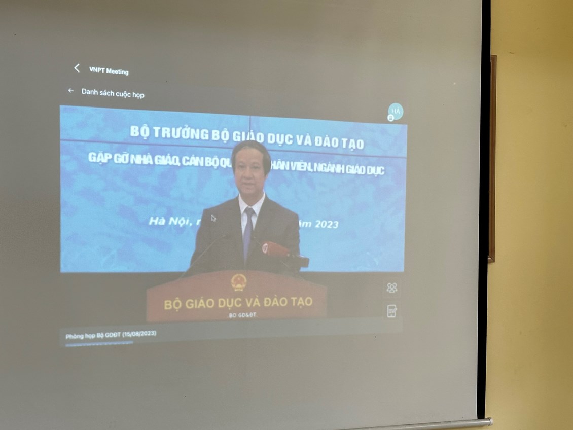 Thực hiện Văn bản số 3947/BGDĐT-NGCBQLGD ngày 04/8/2023 của Bộ Giáo dục và Đào tạo (GD&ĐT), sáng ngày 15/8/2023 trường THCS đã tổ chức điểm cầu trực tuyến chương trình "Bộ trưởng gặp gỡ nhà giáo, cán bộ quản lý, nhân viên ngành Giáo dục - Đào tạo năm 2023"