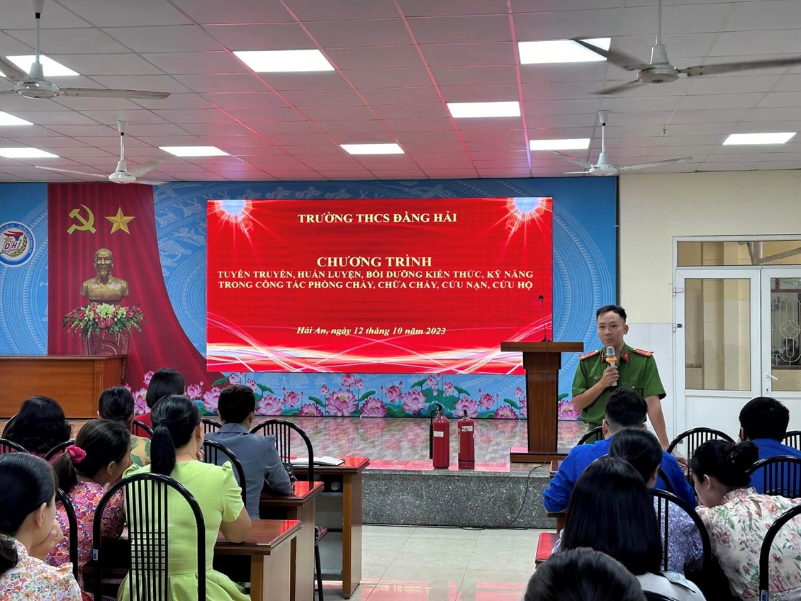 Với mục đích nâng cao nhận thức, vai trò và trách nhiệm của mỗi cán bộ, giáo viên, nhân viên nhà trường đối với công tác phòng cháy chữa cháy. Ngày 12/10/2023, trường đã phối hợp với Công an Phòng cháy chữa cháy Quận Hải An chức buổi tuyên truyền về công tác PCCC và cứu nạn cứu hộ năm 2023.