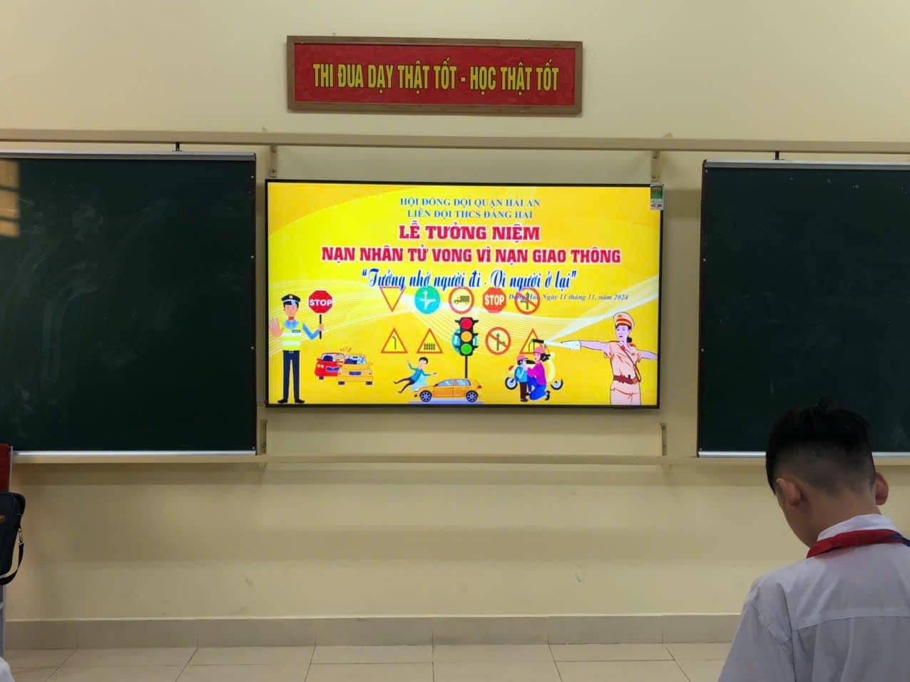 Hưởng ứng chương trình hành động của ban ATGT quốc gia, về tổ chức hoạt động tưởng niệm ác nạn nhân tử vong do tai nạn giao năm 2024. Thứ Hai ngày 11/11/2024, trường THCS Đằng Hải đồng loạt tổ chức lễ tưởng niệm các nạn nhân tử vong do tai nạn giao năm 2024 với thông điệp “Tưởng nhớ người đi - Vì người ở lại ở 100% tại các lớp.
