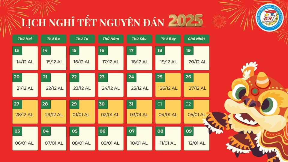 - Thời gian nghỉ: Ngày 25/1/2025 (Thứ Bảy).