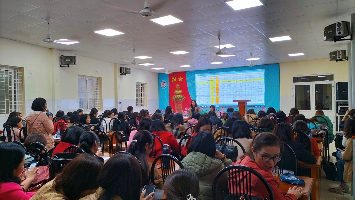 Tại hội nghị, đ/c Nguyễn Thị Yến- PTP đánh giá chất lượng khảo sát của từng trường. Phân tích, tìm giải pháp để nâng cao chất lượng thi vào 10 THPT năm học 2023-2024.