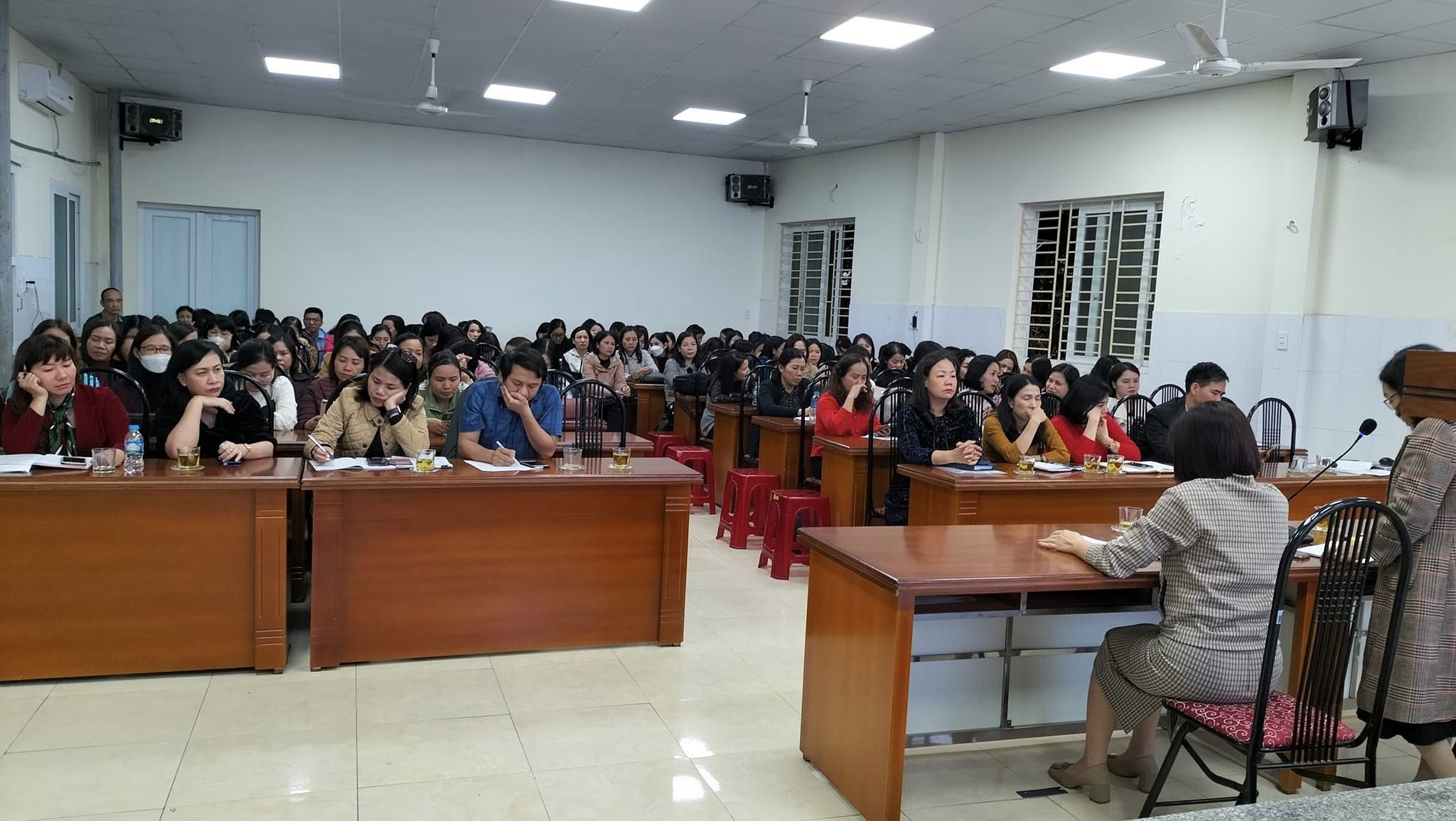 Các đc giáo viên sôi nổi, thảo luận chia sẻ kinh nghiệm công tác ôn thi để đạt kết quả cao.