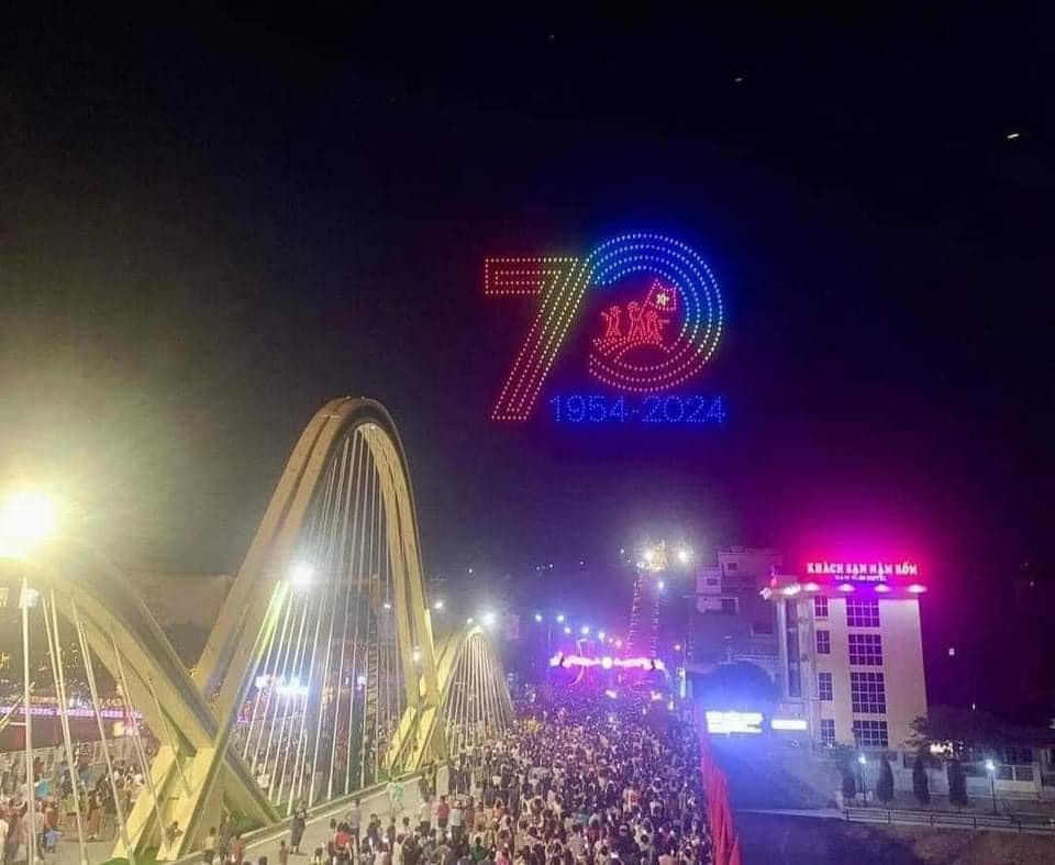 Những hình ảnh đẹp tối 5/5/2024 Đoàn quân xe đạp thồ, bộ đội tiêu diệt máy bay địch, đồi A1, hầm De Castries... là những hình ảnh được 700 drone trình diễn trên bầu trời Điện Biên dịp 70 năm chiến thắng Điện Biên Phủ.