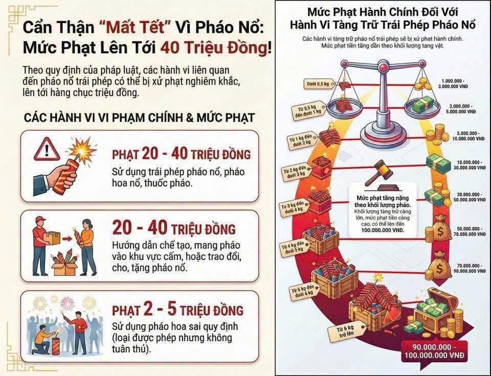 Pháo nổ là mặt hàng nguy hiểm, tiềm ẩn nguy cơ tai nạn, cháy nổ, gây thương tích, ảnh hưởng đến tính mạng, sức khỏe và tài sản của Nhân dân. Việc sản xuất, mua bán, tàng trữ, sử dụng pháo nổ trái phép là hành vi vi phạm pháp luật, sẽ bị xử lý nghiêm theo quy định.