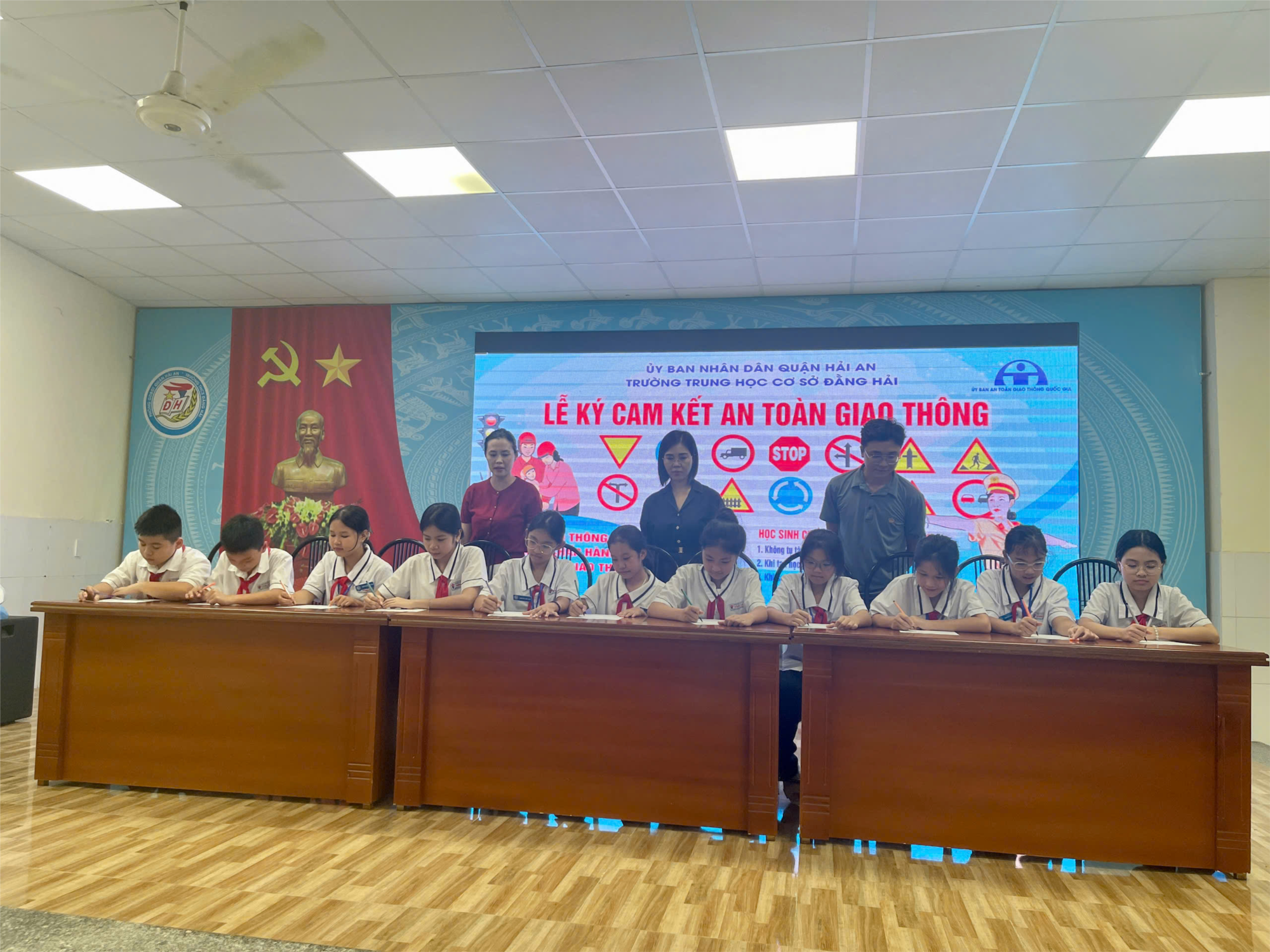 Tổ chức kí cam kết 100% CB- GV-NV , PHHS cùng toàn bộ 2004 em học sinh trường THCS Đằng Hải về thực hiện cam kết thực hiện các quy định về luật giao thông.