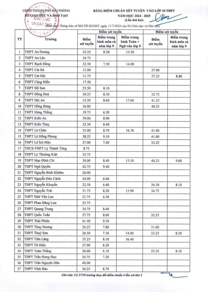 Bảng điểm chuẩn xét tuyển vào lớp 10 THPT Công lập năm học 2024-2025 (lần thứ 2)