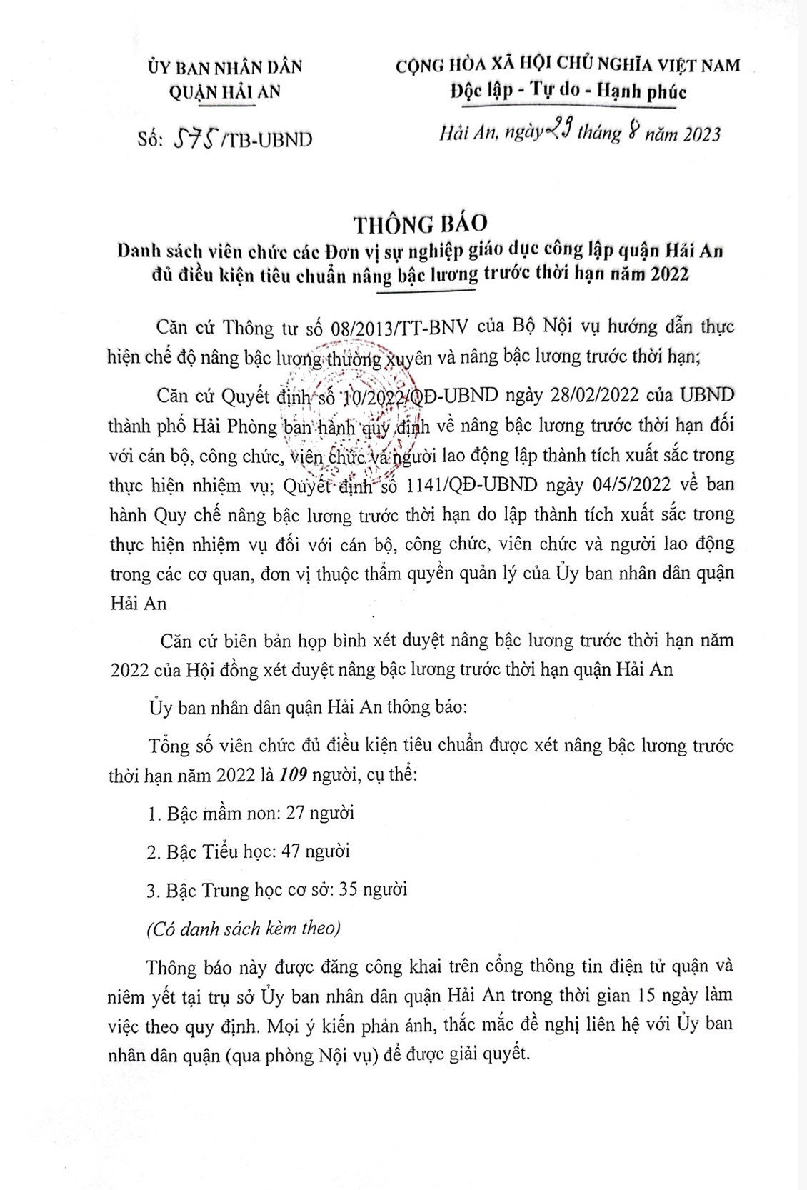 Thông báo danh sách viên chức các đơn vị sự nghiệp giáo dục công lập Quận Hải An đủ điều kiện tiêu chuẩn nâng bậc lương trước thời hạn năm 2022