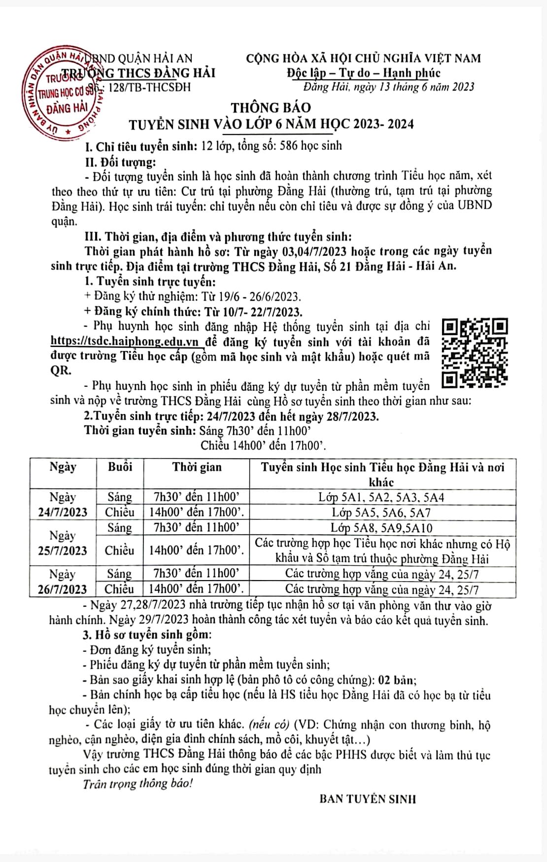 Thông báo Tuyển sinh lớp 6 năm học 2023-2024