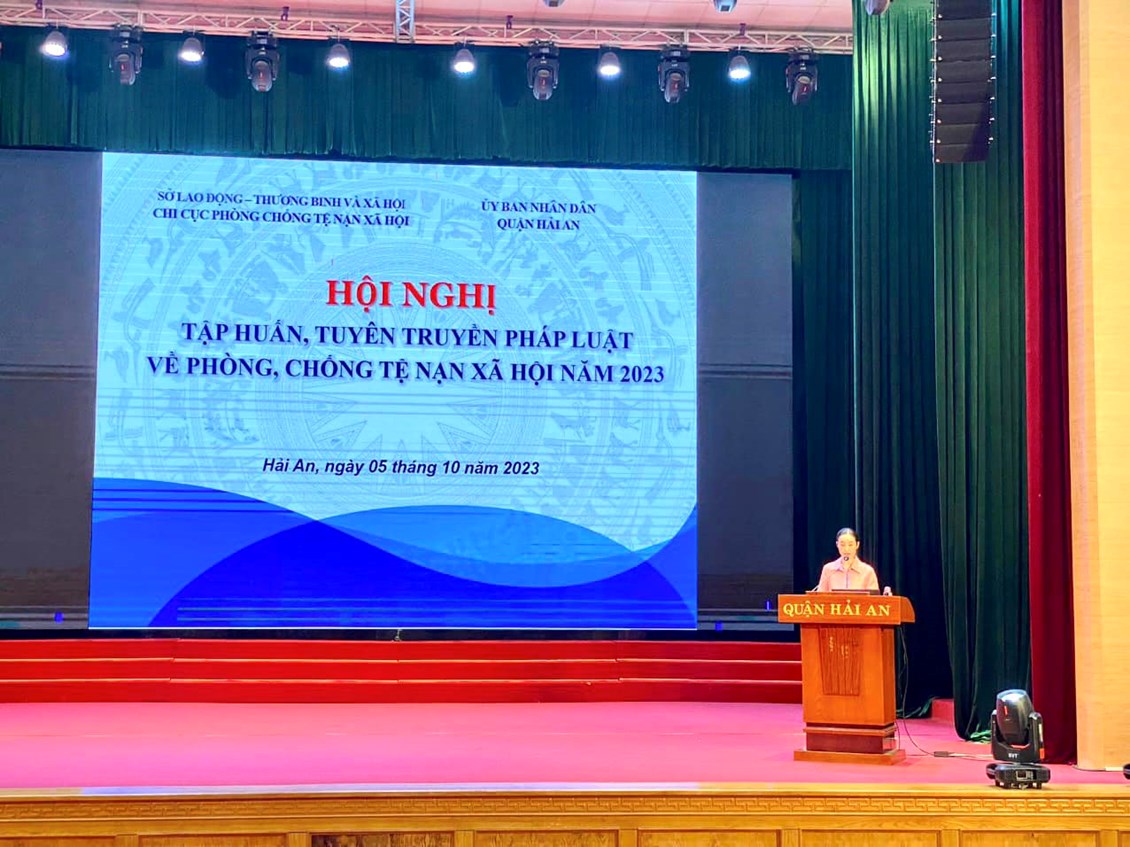 Sáng 5/10, Ủy ban nhân dân quận Hải An phối hợp Chi cục phòng, chống tệ nạn xã hội thành phố tổ chức buổi tuyên truyền, phổ biến chính sách pháp luật về phòng, chống mại dâm; lồng ghép tuyên truyền phòng, chống mại dâm với phòng chống ma túy, mua bán người, HIV/AIDS... cho đội ngũ cán bộ, người dân trên địa bàn quận tại Hội trường trung tâm. Tới dự và phát biểu khai mạc có đồng chí Lê Thanh Tùng – Chi cục trưởng, Chi cục Phòng, chống tệ nạn xã hội thành phố; các đồng chí: Nguyễn Xuân Hải, Trưởng phòng Tổ chức – Hành chính – Kế toán, Chi cục Phòng, chống tệ nạn xã hội, Thành viên Đoàn kiểm tra liên ngành 178 thành phố; Nguyễn Ngọc Bích, Trưởng Phòng Quản lý nghiệp vụ và Tuyên truyền, Chi cục phòng, chống tệ nạn xã hội. Đại biểu quận: đồng chí Phạm Thị Ngọc Minh, Trưởng phòng Lao động -TB&XH, cơ quan thường trực công tác phòng, chống tệ nạn xã hội quận; cùng đại diện lãnh đạo các phòng, ban, đơn vị, nhà trường cấp tiểu học, trung học cơ sở; lãnh đạo UBND, cán bộ LĐTBXH, Công an các phường; Bí thư, Tổ trưởng các Tổ dân phố trên địa bàn quận.