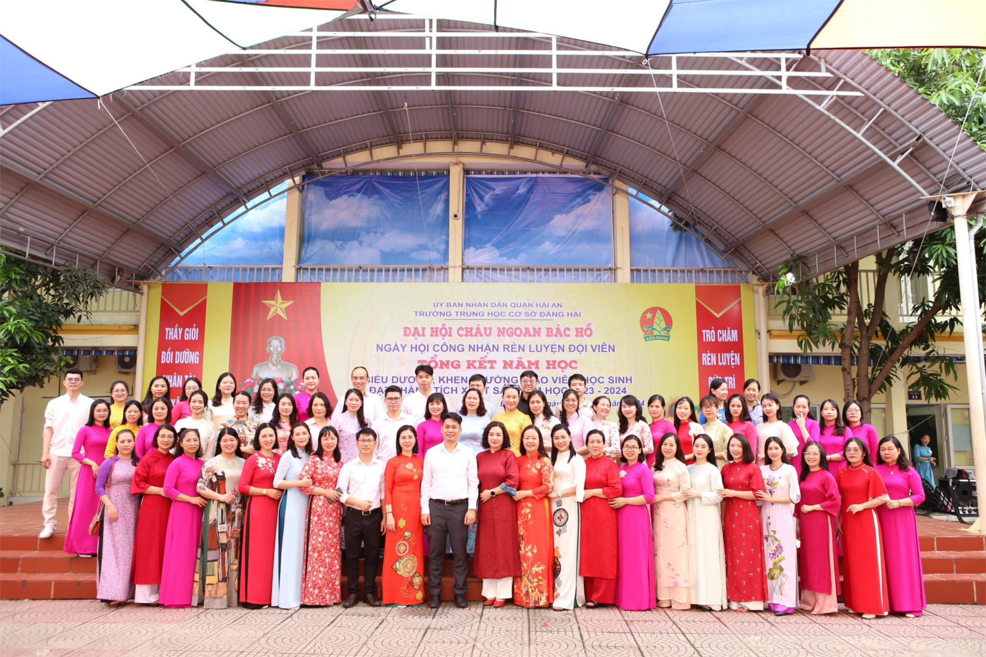 🌷🌷🌷Hòa chung không khí tưng bừng của cả nước và thành phố chào mừng các ngày lễ lớn của tháng 5 lịch sử, chào mừng kỉ niệm 134 năm ngày sinh Chủ tịch Hồ Chí Minh, nhằm động viên, khích lệ kịp thời những thành tích của thầy và trò đạt được trong năm học, sáng ngày 28/5/2024 trường THCS Đằng Hải trang trọng tổ chức lễ tổng kết năm học 2023-2024, Đại hội cháu ngoan Bác Hồ, Ngày hội công nhận chuyên hiệu RLĐV, Lễ tuyên dương phát thưởng và bàn giao học sinh về sinh hoạt Hè tại địa phương