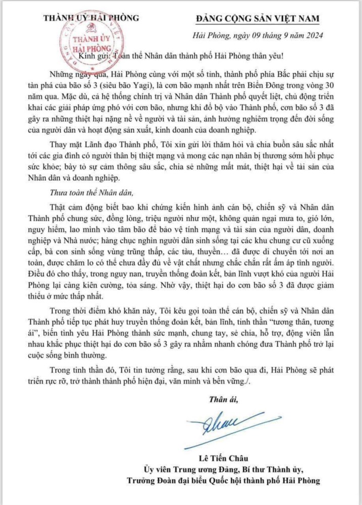 Thư của Bí thư Thành uỷ Hải Phòng đồng chí Lê Tiến Châu gửi nhân dân