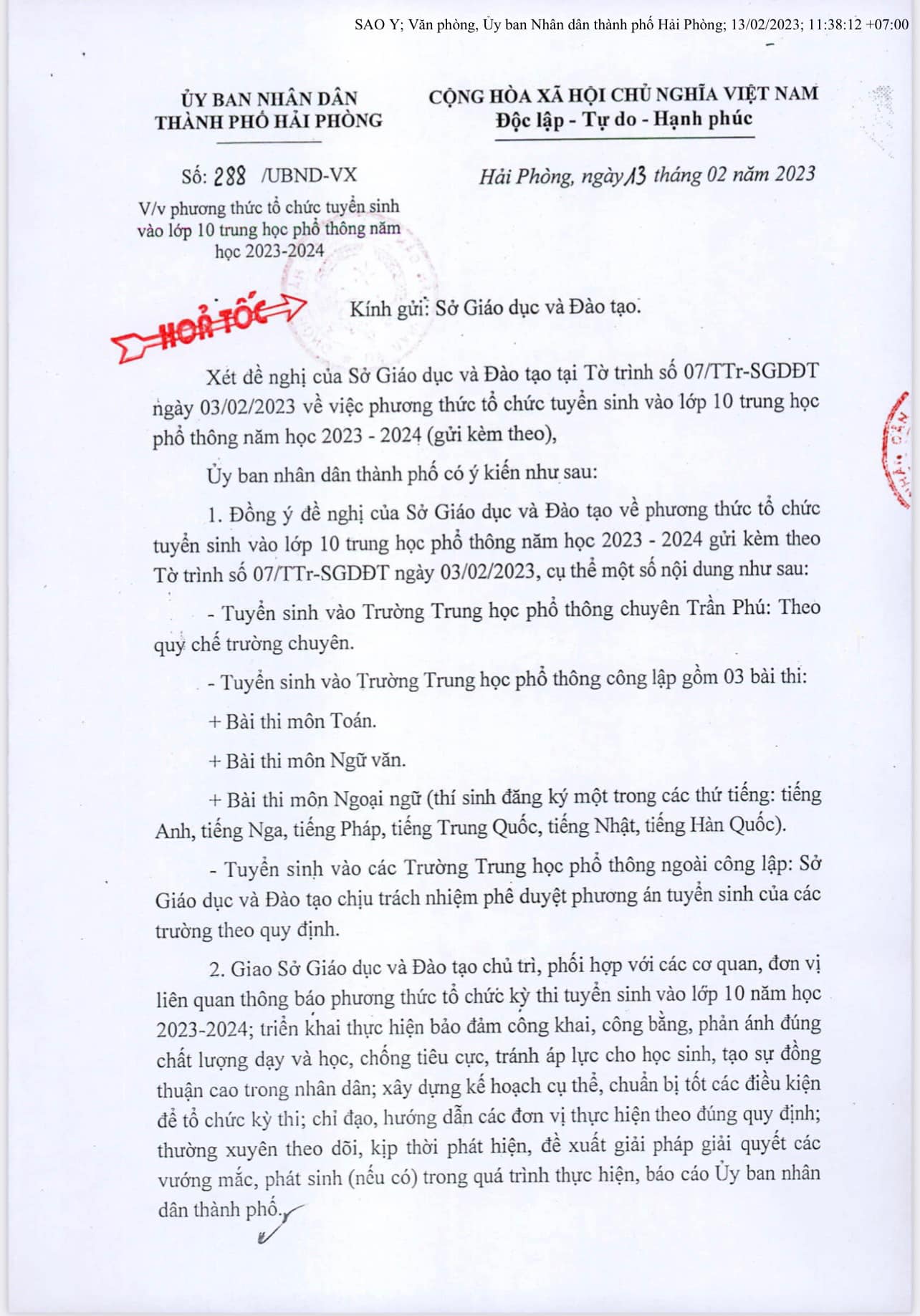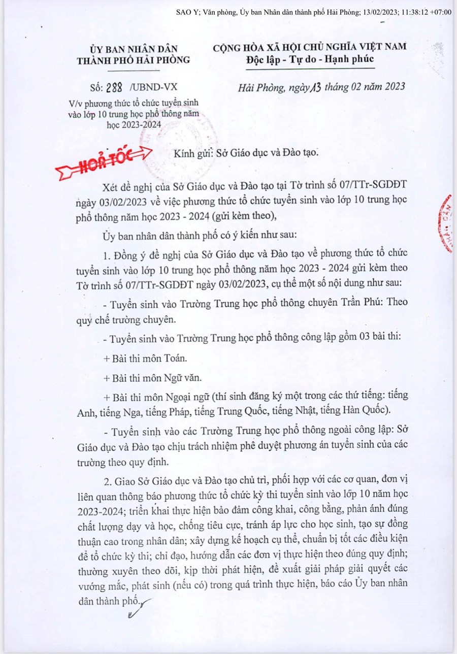 Công văn hoả tốc của UBND Thành phố về việc phương thức tổ chức tuyển sinh vào lớp 10 THPT năm học 2023-2024