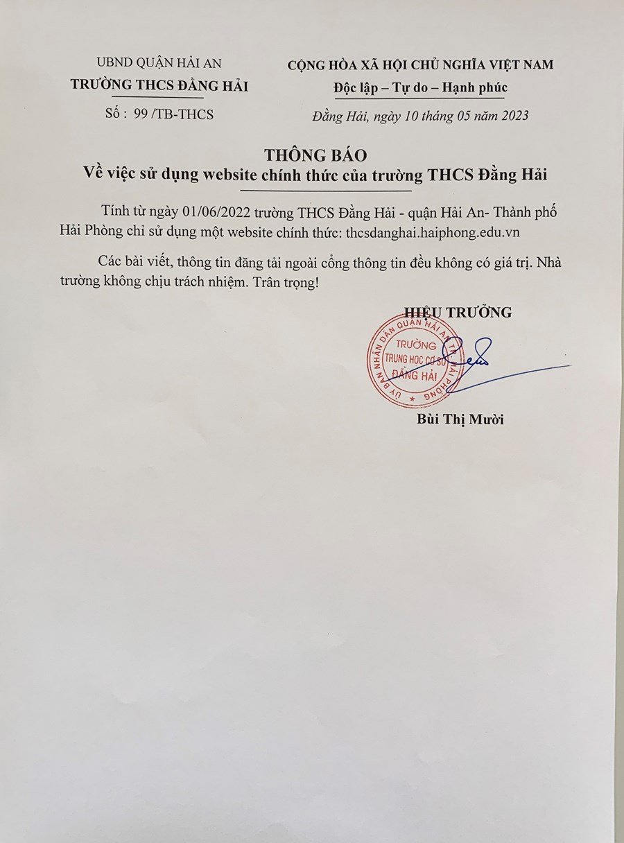 THÔNG BÁO VỀ VIỆC SỬ DỤNG WEBSITE CHÍNH THỨC CỦA TRƯỜNG THCS ĐẰNG HẢI